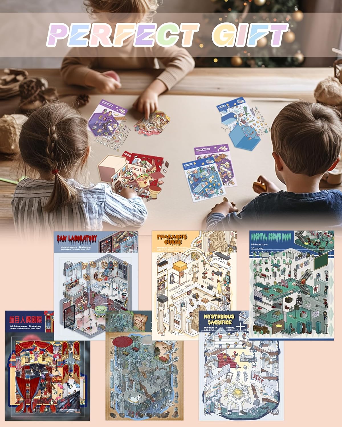 - 💖【6 Frightfully Fab Worlds】These reusable sticker book has 6 themes: Haunted Hospital, Pharaoh's Curse & more. Endless DIY 3D house stickers fun—build individual scary scenes or mash them into a mega mansion!